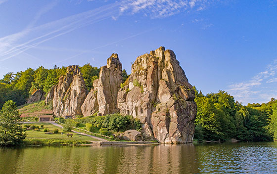 Wohin des Weges? Durch dichte Wälder zum berühmten Hermannsdenkmal oder den mystischen Externsteinen? Entlang kleiner Pfade zu Wildgehegen, Teichen und grünen Parkanlagen? Im Teutoburger Wald fällt die Wahl nicht leicht. Die Mittelgebirgslandschaft am Übergang zur Norddeutschen Tiefebene ist wie geschaffen für einen Wanderurlaub. So bietet sie mit dem Hermannsweg und dem Eggeweg, die zusammen die Hermannshöhen bilden, nicht nur zwei der traditionsreichsten Fernwanderwege Deutschlands, sondern auch viele weitere zertifizierte Qualitätswege und wanderfreundliche Gastgeber, in denen Urlauber herzlich empfangen werden.