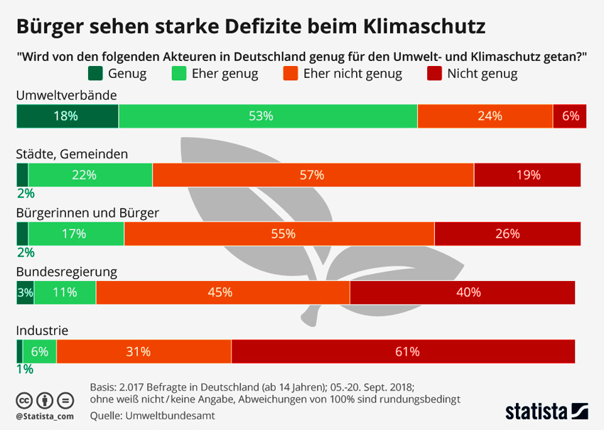 Laut einer aktuellen Umfrage des Umweltbundesamts bewertet die Mehrheit der Deutschen deren Leistungen jedoch als ungenügend. Lediglich von Umweltverbänden meinen 18 Prozent der Befragten, dass diese genug für den Klimaschutz unternehmen würden. Alle anderen Akteure kommen in der Umfrage schlecht weg.