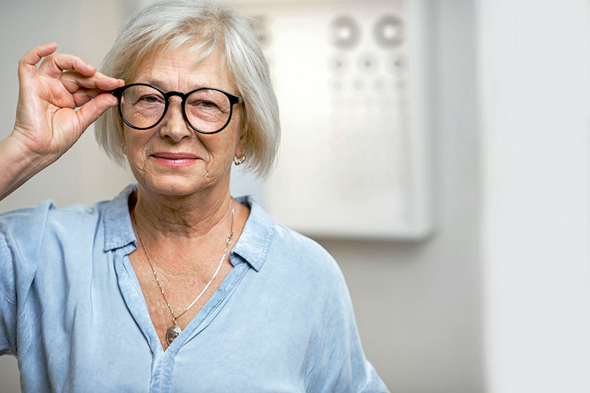Portrait of a happy senior woman wearing eyeglasses in front of