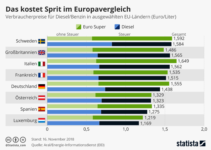 Wie die Grafik von Statista zeigt, kostete der Liter Diesel in Frankreich am 16. November 1,535 Euro pro Liter, Benzin lag laut Daten des Energie-Informationsdienstes (EID) bei 1,515 Euro. Damit liegt der Wert für Benzin unter dem deutschen Preis, der für Diesel darüber. Die höchsten Preise zahlen die Schweden mit 1,592 Euro für Benzin und 1,584 Euro für Diesel.