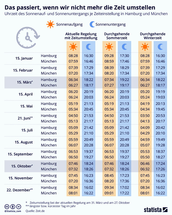 Am Sonntag fand hierzulande die Zeitumstellung statt: Um zwei Uhr nachts wurde die Uhr um eine Stunde vorgestellt auf drei Uhr. Dann gilt bis Ende Oktober die Sommerzeit. Die EU-Kommission hat sich in dieser Woche geeinigt, die Umstellung zum Jahr 2021 abschaffen zu wollen. Was sich dann ändern würde, zeigt unsere Infografik. In der aktuellen Regelung geht die Sonne gegen halb sieben auf, würde die Sommerzeit ganzjährig gelten, wäre es halb acht. Dafür wäre es abends bis fast halb acht hell. Der größte Unterschied würde sich bei dauerhafter Sommerzeit im Dezember und Januar bemerkbar machen, wenn in Hamburg erst um 9.34 Uhr die Sonne aufgeht. Bei dauerhafter Winterzeit würde es dafür im Juni bereits ab 3.50 Uhr hell.