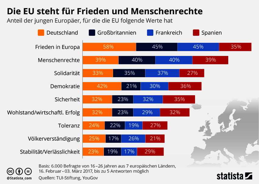 Für junge Menschen in Deutschland, Großbritannien, Spanien und Frankreich steht die EU vor allem für die Sicherung des Friedens in Europa: In einer aktuellen Umfrage der TUI-Stiftung in Zusammenarbeit mit YouGov gaben 58 Prozent der Deutschen dies als den wichtigsten Wert der Staatengemeinschaft an. An zweiter Stelle steht für die Deutschen der Wert der Demokratie (42 Prozent), gefolgt von den Menschenrechten (39 Prozent) und der Solidarität in der EU (33 Prozent), wie die Grafik von Statista zeigt.