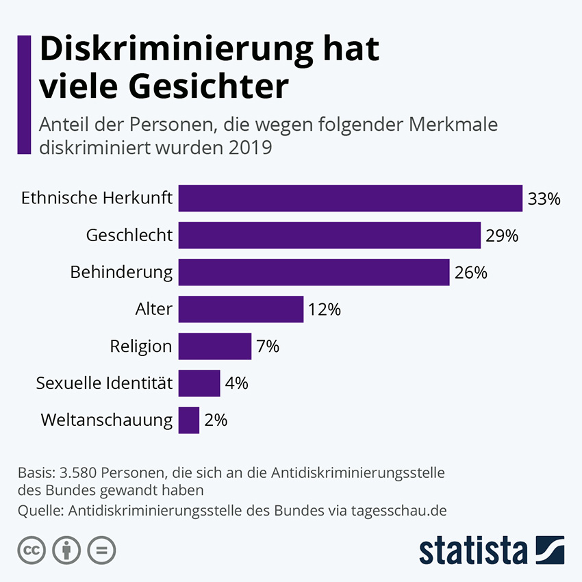 In Deutschland werden Menschen besonders häufig aufgrund ihrer ethnischen Herkunft, ihres Geschlechts oder aufgrund einer Behinderung benachteiligt. Das zeigt die Statista-Grafik auf Basis von Daten der Antidiskriminierungsstelle des Bundes (ADS). Weniger oft kommt Diskriminierung aufgrund des Alters, der Religion, der sexuellen Identität oder der Weltanschauung vor. Insgesamt haben sich im vergangenen Jahr 3.580 Personen (2018: 3.455) mit einem Beratungsgesuch an die ADS gewandt, weil sie sich im Alltag oder Beruf diskriminiert sahen. Die Aufgabe der Behörde ist die Beratung und Unterstützung von Menschen, die Diskriminierungserfahrungen gemacht haben. Zudem betreibt die ADS Öffentlichkeitsarbeit zur Verhinderung und Beseitigung von Diskriminierungen.