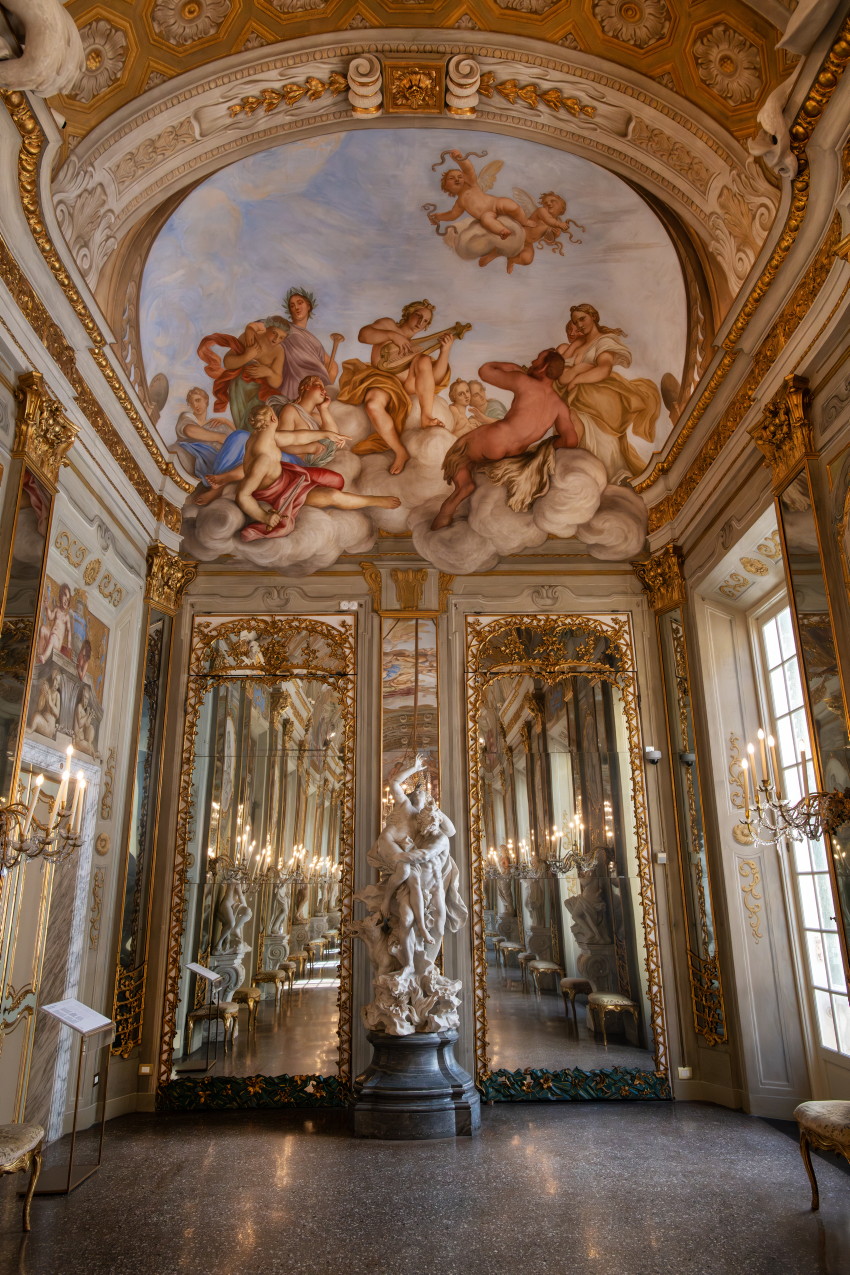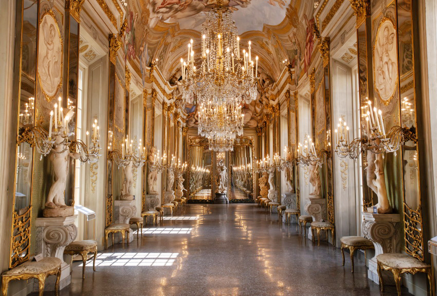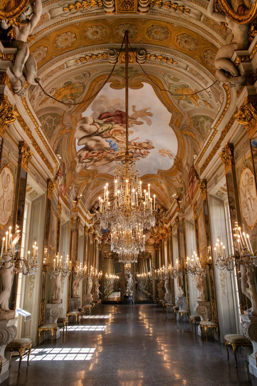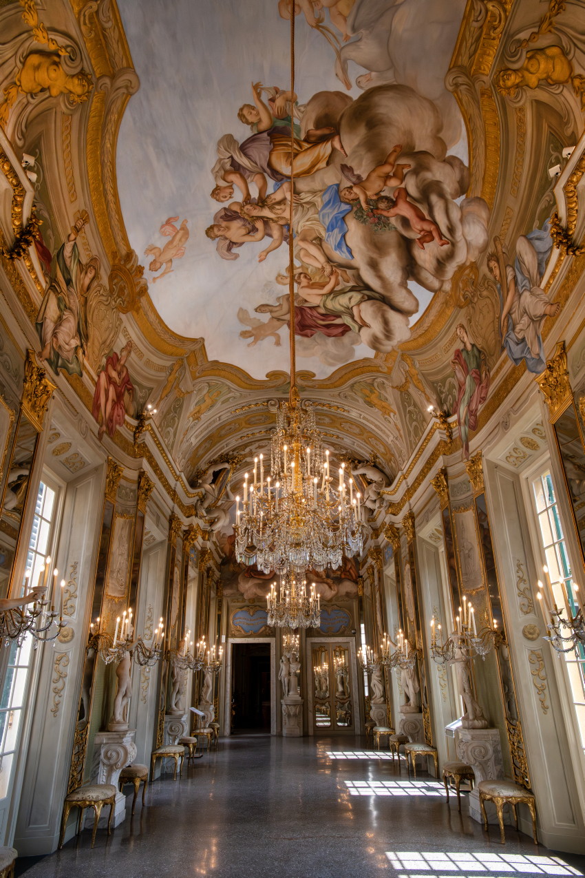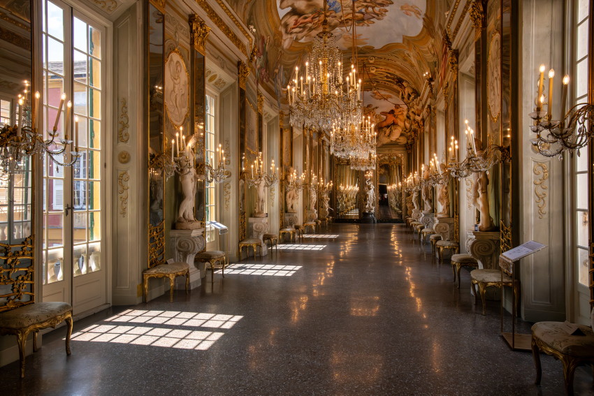 Italien, Genua, 14.05.2025Der Palazzo Reale (Koenigspalast), der im 17. Jahrhundert von der Familie Balbi nach den Entwuerfen von Pier Francesco Cantone erbaut wurde. Da es in Genua kein Schloss gab kaufte der Koenig von Sardinien, Carlo Felice I., den Palast, der von seiner Groeße her den koeniglichen Anspruechen genuegte.Foto: „Spiegelgalerie“, urspruenglich von der Familie Balbi als Raum für die Ausstellung von Gemaelden und Statuen konzipiert,[Copyright by: Sepp Spiegl, Tel.: 0228 9483026, Fax.: 0228 9483027 {53129 Bonn, Moselweg 32, Deutsche Bank-Bonn, IBAN: DE66 3807 0059 0314 9671 01, BIC.: DEUTDEDK380]