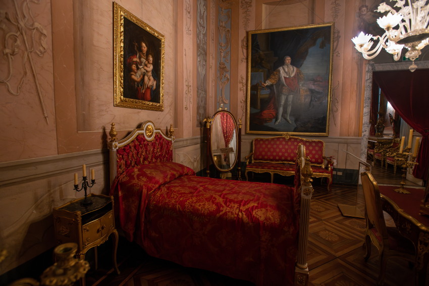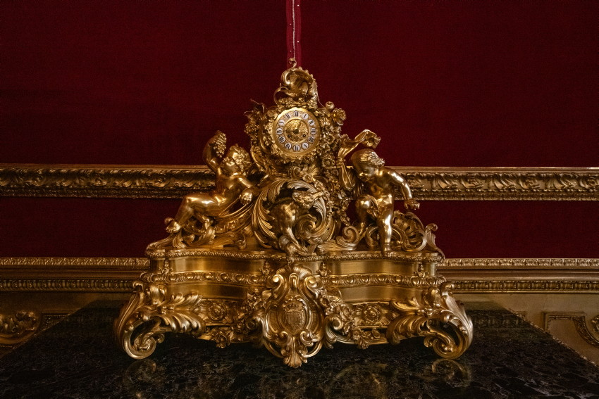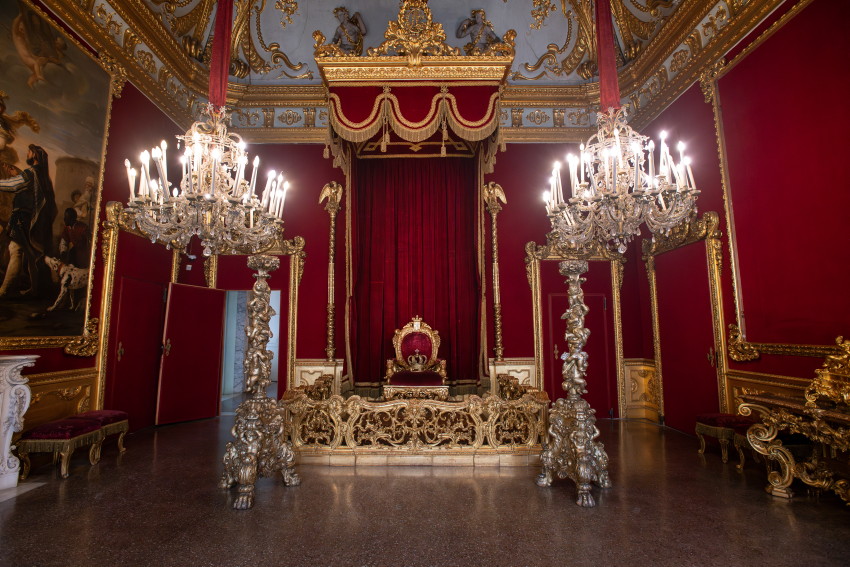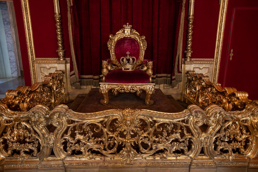 Italien, Genua, 14.05.2025Der Palazzo Reale (Koenigspalast), der im 17. Jahrhundert von der Familie Balbi nach den Entwuerfen von Pier Francesco Cantone erbaut wurde. Da es in Genua kein Schloss gab kaufte der Koenig von Sardinien, Carlo Felice I., den Palast, der von seiner Groeße her den koeniglichen Anspruechen genuegte.Foto: der Audienzsaal, die Damastvorhaenge und -polster tragen zur Pracht des Saals bei, die fuer einen zeremoniellen Raum unabdingbar war. Hier empfing der Herrscher die Mitglieder der Regierung und des Hofes.[Copyright by: Sepp Spiegl, Tel.: 0228 9483026, Fax.: 0228 9483027 {53129 Bonn, Moselweg 32, Deutsche Bank-Bonn, IBAN: DE66 3807 0059 0314 9671 01, BIC.: DEUTDEDK380]