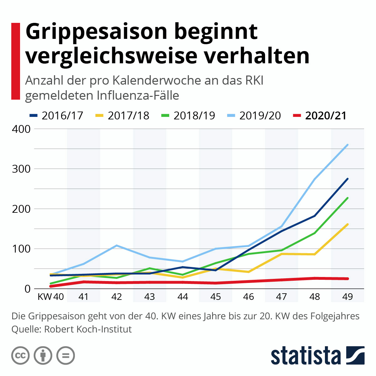 175 Influenzafälle wurden dem RKI seit der 40. Kalenderwoche gemeldet. Dazu heißt es im aktuellsten Wochenbericht: „Die Aktivität der akuten Atemwegserkrankungen in der Bevölkerung ist in der 49. KW 2020 im Vergleich zur Vorwoche bundesweit relativ stabil geblieben und liegt weiterhin deutlich unter dem Niveau der Werte der Vorsaisons. Verantwortlich für den verhaltenen Grippe-Auftakt dürfte die Corona-Pandemie sein. Einerseits weil die geltenden Hygienemaßnahmen auch die Verbreitung der Influenzaviren bremsen, anderseits, weil sich mehr Menschen gegen Grippe haben impfen lassen.