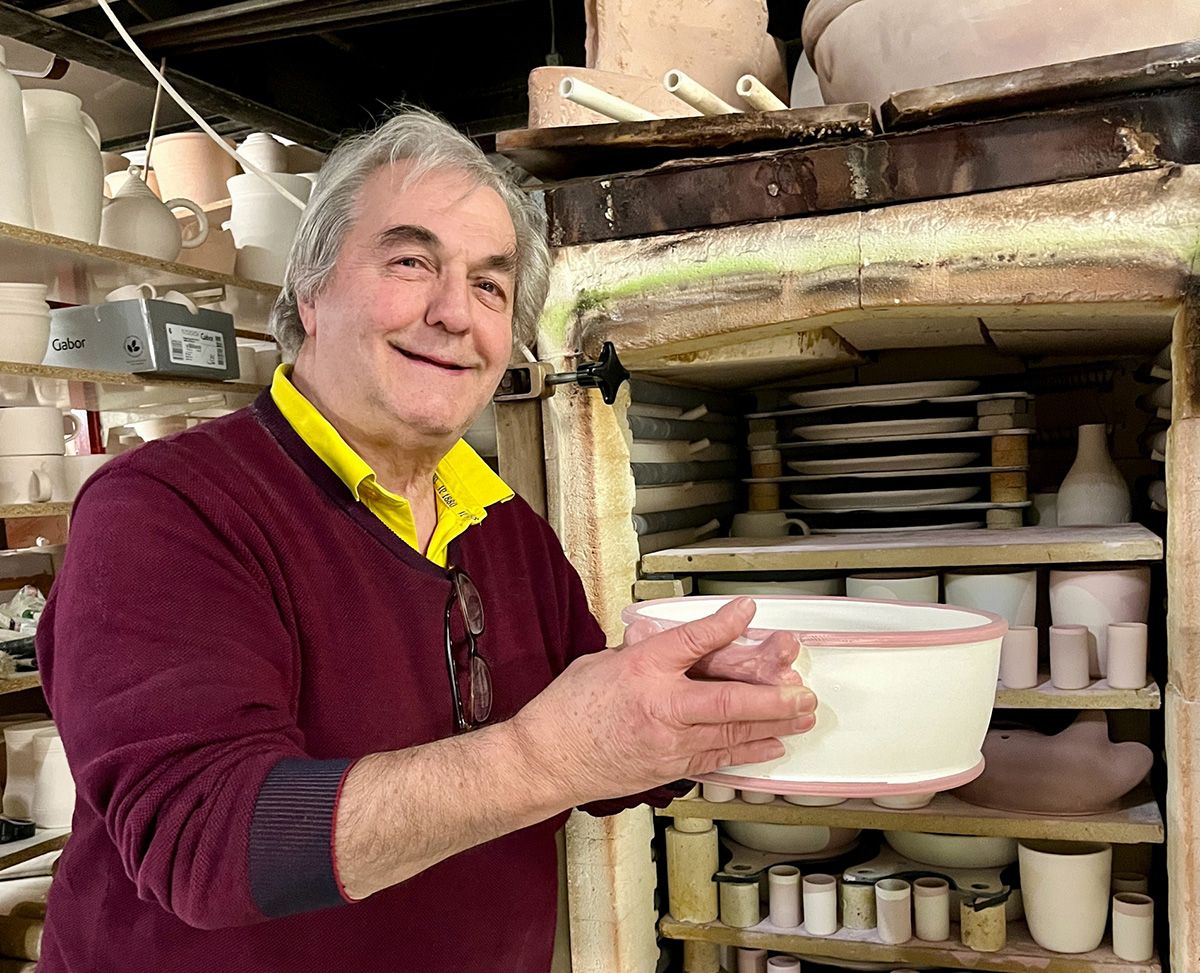 Gerhard Küffer ist froh, dass er zwölf Menschen Arbeit geben und von seinem Beruf gut leben kann. Das Haus an der Goldene-Bären-Straße 1, das früher eine Schmiede, eine Kutschenmacherei und später eine Autowerkstatt beherbergte, gehört ihm. Hier lebt und arbeitet er. Sein Geschirr verkauft sich gut, auch bei der regionalen Gastronomie. Küffers Teller, Tassen und Schalen tragen seine Handschrift und werden auch nach individuellen Wünschen gefertigt.