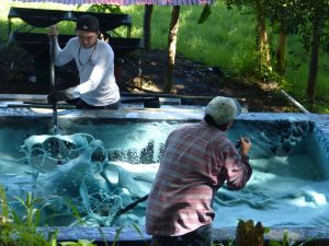 Doch vorbei ist vorbei. Und Dieter lässt von einigen seiner Plantagen-Spezialisten vorführen, wie es geht. Zunächst fermentieren grüne Zweige des Indigo-Strauches einen ganzen Tag lang in einem Bassin. Dadurch entsteht ein stark riechender giftgrüner Saft, der durch einstündiges kräftiges Aufpeitschen der Oberfläche mit Luftsauerstoff angereichert wird. Und sich dabei, völlig überraschend für uneingeweihte Zuschauer, immer mehr ins Blaue verfärbt. Dann ist es nur noch eine Frage der Geduld, um in weiteren Arbeitsschritten jenes indigoblaue Pulver zu gewinnen, auf das die Jeans-Industrie seit Lévy-Strauß begierig wartet. Und nicht nur die, wie die anschließende praktische Einführung in das Batik-Kunsthandwerk beweist.