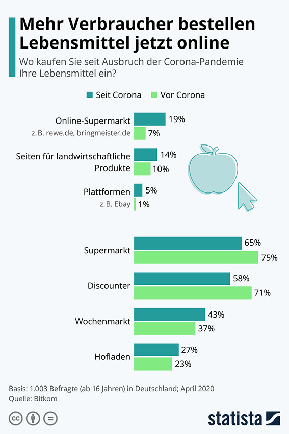 Vor Corona gaben erst sieben Prozent der Befragten an, Online-Services wie rewe.de oder bringmeister.de zu nutzen – seit der Pandemie sind es nun 19 Prozent. Der Anteil der Verbraucher, die Lebensmittel auf Internetseiten für landwirtschaftliche Produkte einkaufen, ist von 10 auf 14 Prozent gestiegen, wie die Statista-Grafik zeigt. Dagegen ist der Anteil der Kunden, die in stationären Supermärkten einkaufen, entsprechend gesunken, von 75 Prozent vor der Corona-Krise auf nun 65 Prozent.