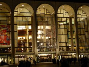 Selbst die ehrwürdige Metropolitan Opera gehört im weitesten Sinne zu den Broadway-Aufführungsstätten hinzu. Ehrfurcht gebietend lässt das festlich erleuchtete Gebäude keinen Zweifel daran, dass es mit seinen riesigen Dimensionen alle anderen Broadway-Schauplätze an Größe bei weitem übersteigt. Allein die langen schlanken Säulen, die die riesige Glasfassade unterteilen, zeichnen sie als einen Musentempel der besonderen Art aus.