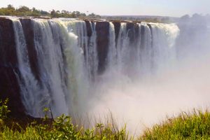 Behäbig wälzt er sich in seinem breiten Bett. Denn noch ahnt der mächtige Sambesi nichts von seinem Ungemach, das ihm als einem der größten Flüsse Afrikas unmittelbar bevor steht. Doch dann packt ihn ein jähes Erwachen, als ihn eine schroff nach unten abfallende Felswand von der Bettkante herab zu ziehen droht. Noch im Fallen entwickelt er Wut schnaubend eine tosend aufsprühende Gischt, die im Umkehrschub als „Donnernder Rauch“ vom Grund der breiten Felsspalte sogleich wieder nach oben zu entweichen versucht.