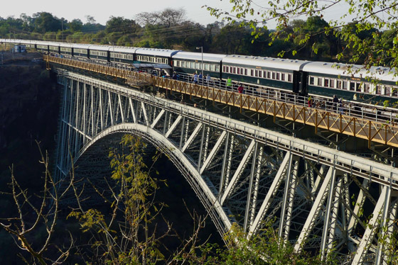 Doch lohnt es sich wirklich, nach Verlassen des Bahnhofs von Victoria Falls noch die eigene Suite aufzusuchen? Denn nur wenige Kilometer entfernt wartet die Victoria Falls-Brücke, deren mächtige Stahlkonstruktion bereits seit kolonialen Zeiten in kühnem Bogen die 120 Meter tiefe Schlucht des Sambesi überspannt. Unsichtbar, aber nicht ohne politische Brisanz, verläuft quer über ihre Mitte die Grenze zwischen Simbabwe und Sambia, den Nachfolgestaaten des einstigen Rhodesiens.
