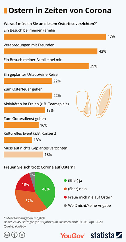 Kein Osterfeuer, kein Gottesdienst, kein Frühstück mit der Familie: Wegen der Einschränkungen aufgrund des Coronavirus müssen die Deutschen an diesem Osterfest auf vieles verzichten. Eine aktuelle Umfrage von Statista mit YouGov Deutschland zeigt, welche Aktivitäten an Ostern diesmal für viele ausfallen: