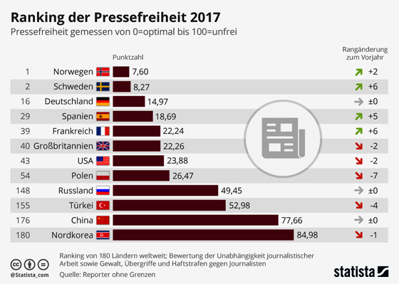 Die Statista-Grafik zeigt die aktuelle Rangliste der Pressefreiheit von der Organisation Reporter ohne Grenzen. Das Ranking wurde am 26. April 2017 veröffentlicht, bezieht sich jedoch noch auf die Situation im Jahr 2016. Die besten Arbeitsbedingungen haben Journalisten demnach in den skandinavischen Ländern, allen voran Norwegen. Deutschland steht unverändert auf Platz 16 des Rankings. Deutlich verschlechtert hat sich die Pressefreiheit dagegen in Polen, das um 7 Plätze im Ranking auf Platz 54 abrutschte. Die Türkei verschlechterte sich ebenfalls um 4 Ränge und steht nun auf Platz 155 von 180 betrachteten Ländern.