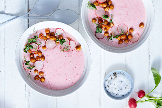 Radieschen-Suppe mit gerösteten Kichererbsen © djd-mk/Molkerei Alois Müller