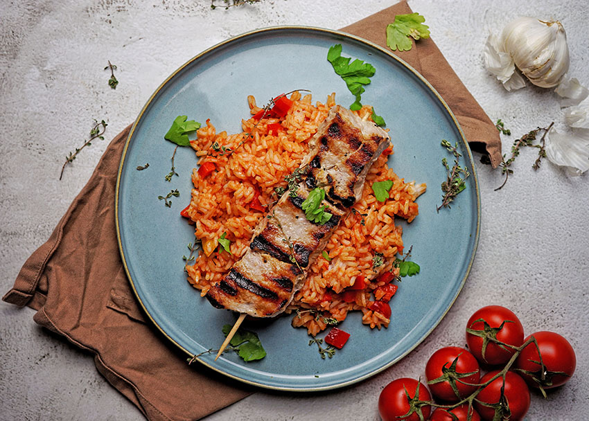 Rezepttipp: Zart marinierter Griechenspieß mit Tomaten-Paprika-Reis