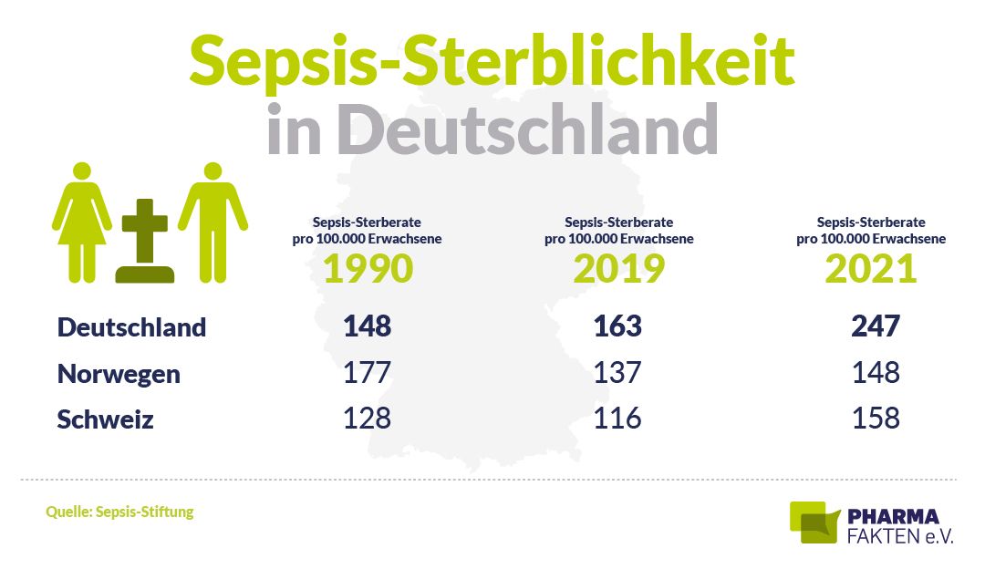 gerät und beginnt, die eigenen Organe zu schädigen. Sie ist ein akuter Notfall, bei dem Zeit eine wesentliche Rolle spielt: „Jede Stunde zählt“, heißt es dazu bei „Deutschland erkennt Sepsis“, eine Kampagne verschiedener Organisationen, die vom Bundesgesundheitsministerium gefördert wird. Mit mindestens 85.000 Toten ist sie eine der häufigsten Todesursachen – doppelt so viele Menschen sterben im Krankenhaus an Sepsis wie an Schlaganfall und Herzinfarkt zusammen.
