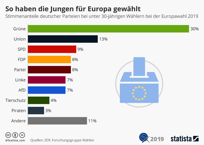 Der Blick auf das Wahlverhalten der 18 bis 29-Jährigen zeigt: Die Grünen haben in dieser Wählergruppe mehr Stimmen bekommen als Union und SPD zusammen. Die Wahrscheinlichkeit, dass sich der Abstieg der beiden großen Volksparteien in Zukunft fortsetzen wird, ist somit groß. Die Satirepartei Die Partei kommt bei den jungen Wählern auf starke 8 Prozent und liegt damit gleichauf mit der FDP. Die Partei fällt u.a. in sozialen Netzwerken regelmäßig durch Videoclips auf, in welchen sie das Geschehen im EU-Parlament kritisch begleitet. Das starke Abschneiden der Partei kann als ein mögliches Indiz dafür gewertet werden, dass die Präsenz in digitalen Medien für alle Parteien immer wichtiger wird.