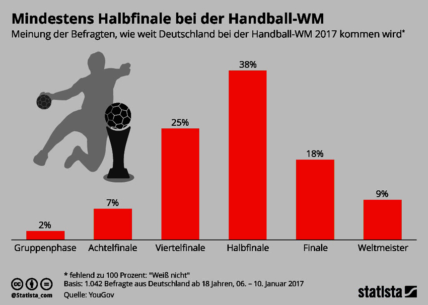 Die Erwartungen an das deutsche Team sind groß. Laut einer repräsentativen Umfrage des Forschungsinstituts YouGov erwarten 38 Prozent der Deutschen, dass das Nationalteam der Handballer das Halbfinale erreichen wird. 18 Prozent trauen dem Team zu, ins Finale einzuziehen und 9 Prozent glauben, dass Deutschland Weltmeister wird.