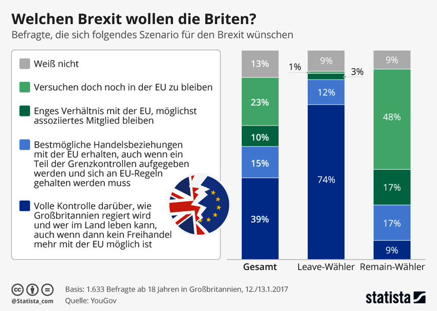 Am heutigen Dienstag wird das Urteil des Supreme Court, dem höchsten britischen Gericht, zum Brexit erwartet. Die Entscheidung legt fest, wer an dem Austritt der Briten aus der EU beteiligt sein wird. Premierministerin Theresa May will einen Austritt ohne Beteiligung des Parlaments, was zu einem „Hard Brexit“ führen dürfte. Unter Beteiligung des Parlaments wäre ein so genannter „Soft Brexit“ wahrscheinlicher, also zwar ein Austritt, aber mit weniger harter Abgrenzung zur EU. Laut einer aktuellen YouGov-Umfrage spricht sich die Mehrheit der Briten eher für einen „Soft Brexit“ aus. Insgesamt sind 39 Prozent der Befragten für einen harten Ausstieg, der die volle Kontrolle über das Land ermöglicht, dafür aber eingeschränkte Handelsbeziehungen mit sich bringt. Demgegenüber stehen 23 Prozent, die am liebsten doch in der EU bleiben würden, wie die Grafik von Statista zeigt. 10 Prozent wünschen sich ein enges Verhältnis zur EU, möglichst als assoziiertes Mitglied und 15 Prozent wünschen sich bestmögliche Handelsbeziehungen, trotz Einschränkungen bei Grenzkontrollen.