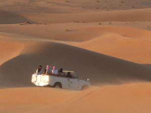 Eine weitere Möglichkeit, dem Bauboom der Großstadt zu entfliehen, bietet eine Wüstensafari unmittelbar vor den Toren Dubais. Sich mit Fahrer Eric auf einem vierradgetriebenen Geländewagen von einer Waschbrettpiste durchrütteln zu lassen oder sanft über feinsandige Dünenkämme hinweg zu gleiten, stellt ein intensives und zugleich begeisterndes Naturerlebnis dar. Schon während des Wettlaufs mit den plötzlich aus dem Nichts heraus auftauchenden weißen Gazellen nähert sich die Sonne dem Horizont. Dabei werden die Schatten der mit ihren Beduinenkopftüchern verwegen aussehenden Gestalten auf den Rückbänken immer länger. Der Weg als das Ziel?