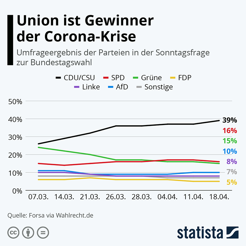 Die Union ist bisher der größte Gewinner unter der Parteien während der Corona-Pandemie. Mit der zunehmendem Verschärfung der Corona-Krise seit Anfang März sind die Zustimmungswerte von CDU/CSU in der Sonntagsfrage zur Bundestagswahl von Forsa gestiegen und liegen mittlerweile bei 39 Prozent. Zum Vergleich: Am 07. März hatte die Union noch bei 26 Prozent gelegen.