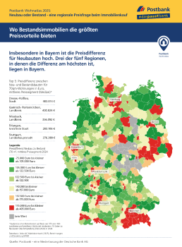 „Die erheblichen Preisaufschläge für Neubauten in einigen Regionen entstehen durch ein knappes Angebot an Bauland in Verbindung mit den hohen und weiterhin steigenden Baukosten. In einigen Gebieten bleiben Bestandswohnungen selbst inklusive der Sanierungskosten preiswerter“, sagt Manuel Beermann, verantwortlich für das Immobiliengeschäft bei der Postbank. „Bestandswohnungen haben den Vorteil, dass Käufer*innen das Objekt direkt prüfen können, statt sich nur anhand von Plänen vorzustellen, wie hell oder geräumig die Immobilie sein könnte. Gerade deshalb ist es wichtig, Fachleute hinzuzuziehen, um versteckte Mängel zu erkennen. Nur wer den Zustand von Bausubstanz, Elektroinstallationen und Dämmung genau kennt, kann den Preis realistisch bewerten.“
