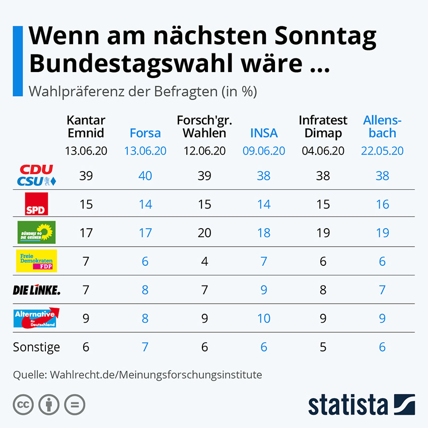 Die Union kann sich bei der Wahlpräferenz der BundesbürgerInnen weiter klar an der Spitze halten. Ihre Umfragewerte liegen bei der Sonntagsfrage stabil zwischen 38 und 40 Prozent. Die Grünen liegen in allen Erhebungen wieder vor der SPD, nachdem beide Parteien sich zuletzt stark angenähert hatten. Die Linkspartei liegt bei allen Instituten bis auf Emnid knapp vor der FDP. Die AfD kommt nur noch bei INSA auf einen zweistelligen Umfragewert.