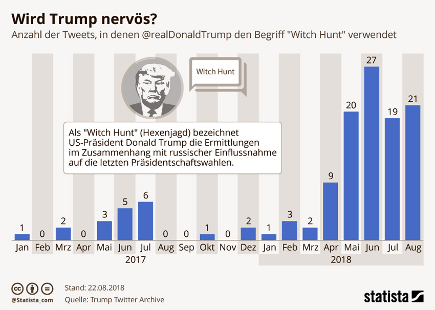 Als „Witch Hunt“ (Hexenjagd) bezeichnet Donald Trump die Ermittlungen im Zusammenhang mit russischer Einflussnahme auf die letzten Präsidentschaftswahlen. Dass dieses Thema für ihn an Brisanz zunimmt, lässt sich nicht nur den Medien, sondern auch den Twitter-Aktivitäten des US-Präsident entnehmen. Laut Trump Twitter Archive hat @realDonaldTrump den Begriff „Witch Hunt“ 2017 insgesamt 20 Mal verwendet. Dagegen waren es im laufenden Jahr bereits 102 Nennungen – davon 87 seit Mai. Wie es wirklich im Inneren des US-Präsident aussieht, lässt sich von außen nur schwer mit Sicherheit sagen – aber es darf schon angenommen werden, dass sein Stresslevel gerade steigt.
