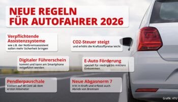 Neues Jahr, neue Regeln für Autofahrer: Im Jahr 2026 treten einige Neuerungen in Kraft, die jeder kennen sollte. Vom digitalen Führerschein über eine verschärfte Abgasnorm bis zur Erhöhung der CO2-Steuer kommt einiges auf die Autofahrer zu. ATU Experte Christopher Lang beleuchtet die zentralen Änderungen und erklärt, wo finanzielle Entlastungen oder zusätzliche Belastungen zu erwarten sind.